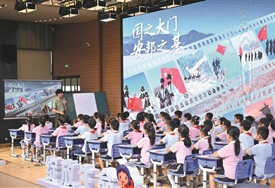 本报讯陈君杰、周宁报道:“何以为国?又何为国防?同学们,今天,就让我们从‘国’字里找答案。‘国’的繁体字写为‘國’,中间的‘口’象征疆域领土,‘戈’是‘柲’的象形,代表武器,二者组合在一起寓意着建设国防、保卫家园……”