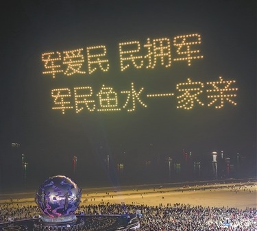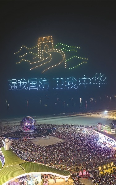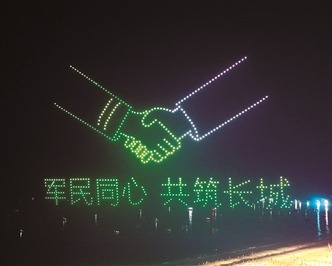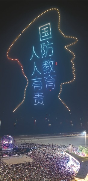活动现场,600架无人机编队列阵腾空,以夜空为幕,以光影为笔,在夜空中绘出“参军报国无上光荣”“军爱民民拥军军民鱼水一家亲”“国防教育从娃娃抓起”等标语。