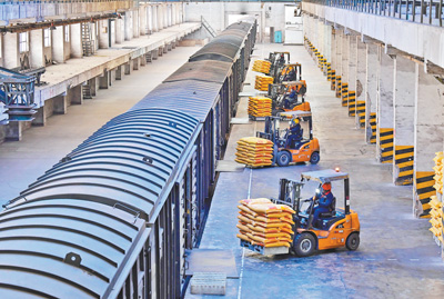 | 2月8日,工作人员在贵州省福泉市瓮福化工公司装运化肥。龙建睿摄(影像中国) |