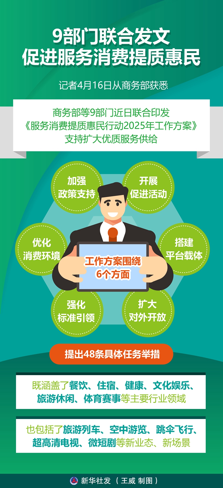 工作方案围绕加强政策支持、开展促进活动、搭建平台载体、扩大对外开放、强化标准引领、优化消费环境等6个方面,提出48条具体任务举措,既涵盖了餐饮、住宿、健康、文化娱乐、旅游休闲、体育赛事等主要行业领域,也包括了旅游列车、空中游览、跳伞飞行、超高清电视、微短剧等新业态、新场景。