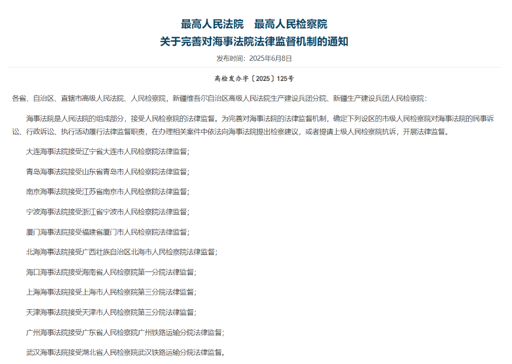 “两高”明确:11个检察院对海事法院实行“一对一”监督