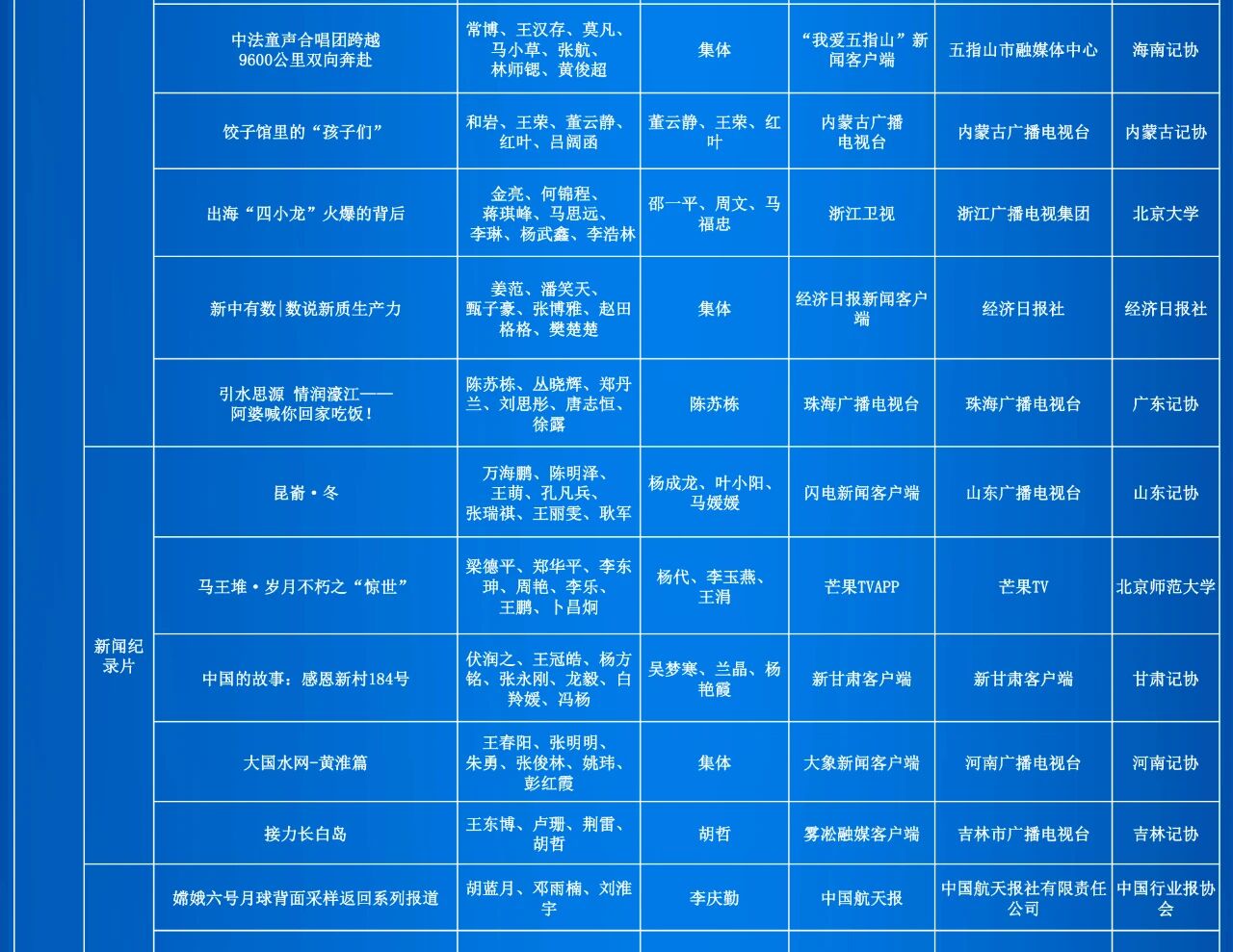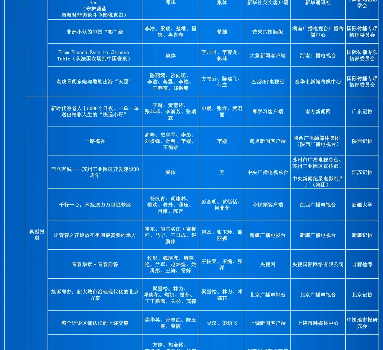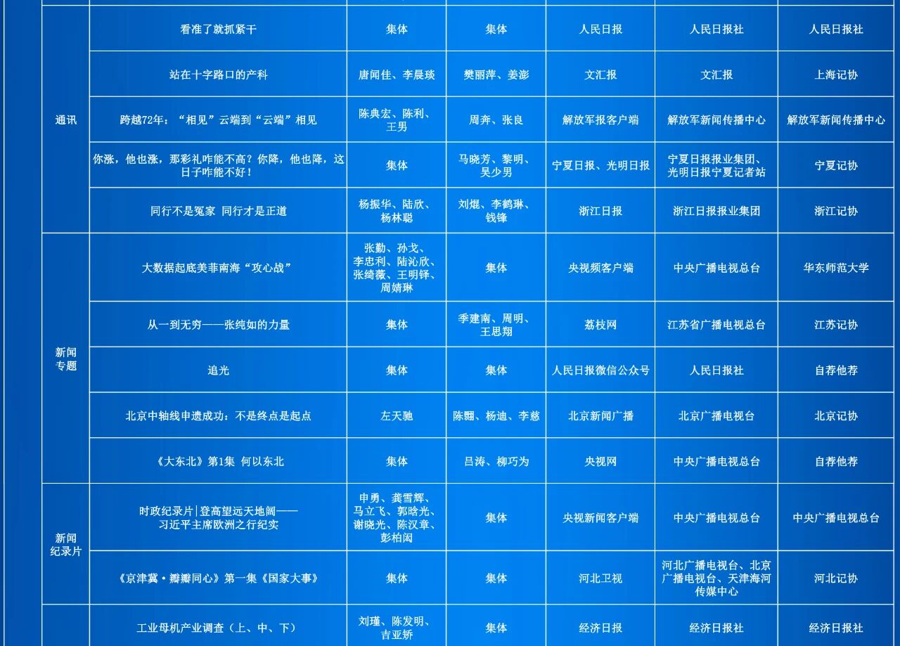 由中华全国新闻工作者协会(简称“中国记协”)主办的第35届中国新闻奖评选结果自今日起在中国记协微信公众号、中国记协网公示。本届拟获奖作品379件,其中特别奖4件、一等奖75件、二等奖113件、三等奖187件。同时,公示本届中国新闻奖评选细则和评委、审核委员名单。