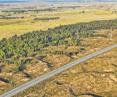 “十四五”时期,“三北”工程攻坚战取得阶段性成效。图为内蒙古库布其沙漠北缘锁边林带。 新华社记者 李志鹏摄 |