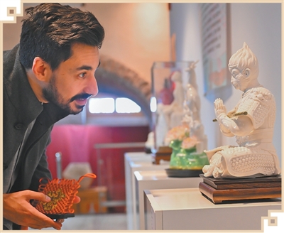 2025年11月11日,一名参观者在西班牙塔拉韦拉文化中心欣赏德化白瓷展品。新华社记者程敏摄 |