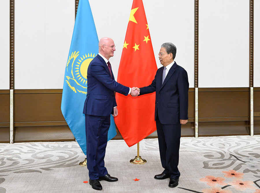 3月25日上午,全国人大常委会委员长赵乐际在海南博鳌会见来华出席博鳌亚洲论坛2026年年会的哈萨克斯坦第一副总理斯克利亚尔。新华社记者 申宏 摄