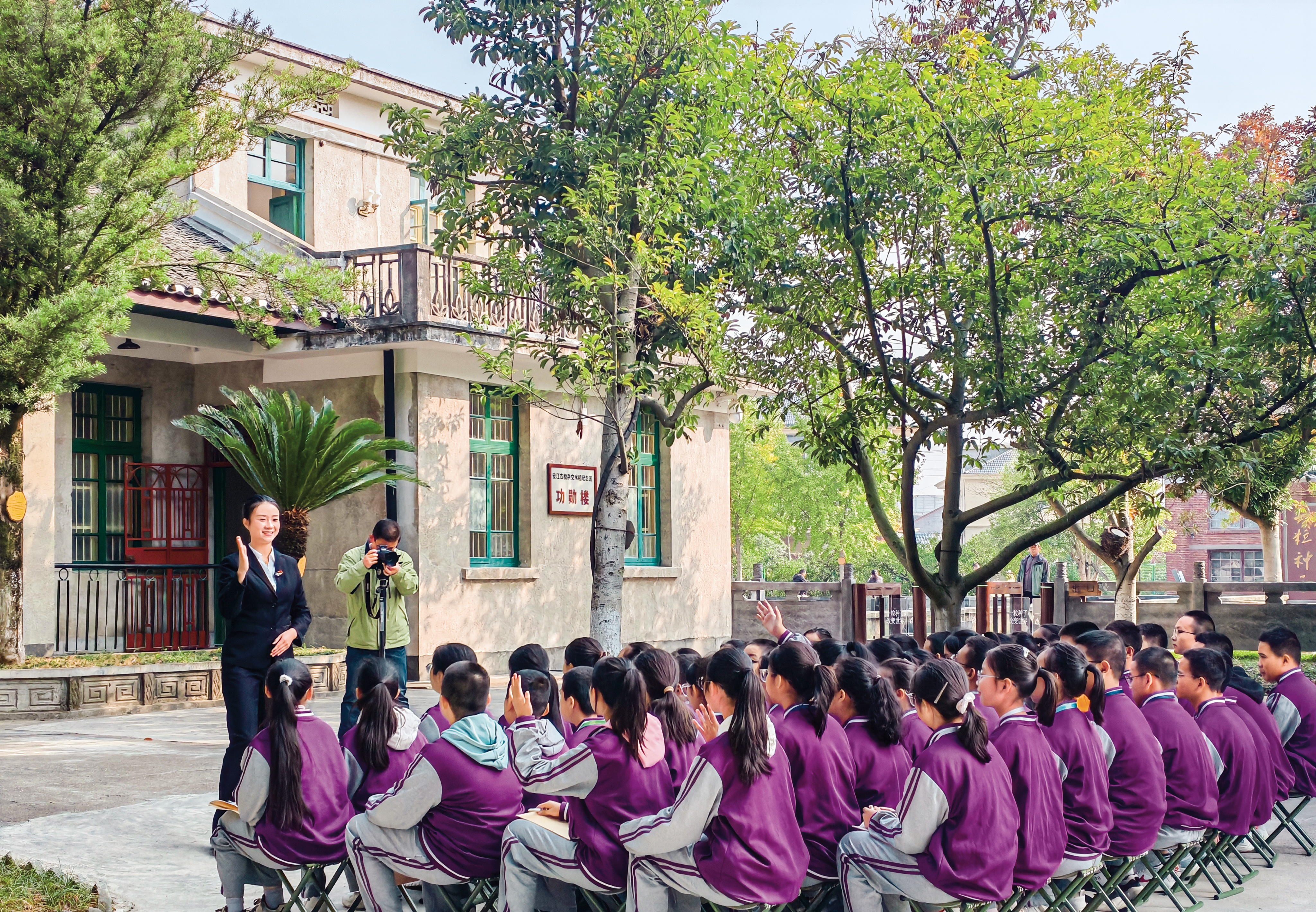 怀化市安江思政教育实践中心老师在袁隆平旧居前,给学生讲《身边的科学家——宝藏爷爷袁隆平》思政课。陈长松摄
