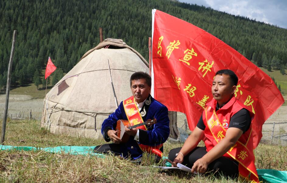 福海县冬不拉“马背宣讲”小分队成员向当地牧民宣讲党的惠民政策 批丽扎提 摄