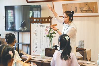 在书店街王大昌茶坊,党员志愿者为游客讲解“宋代七汤点茶”非遗技艺。