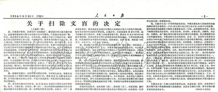 1956年3月31日,《人民日报》刊登的《关于扫除文盲的决定》。中央档案馆馆藏