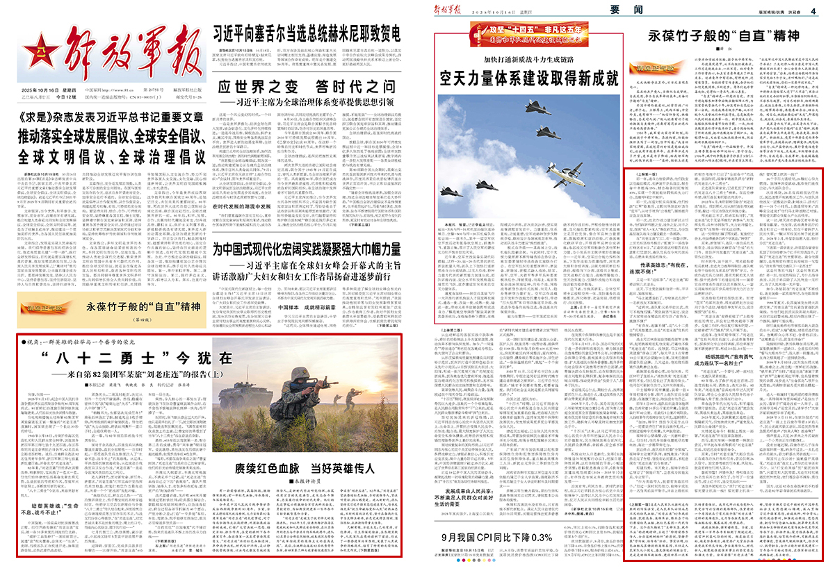 今年是中国人民抗日战争暨世界反法西斯战争胜利80周年。当前,全军正持续深化政治整训,大力宣传第82集团军某旅“刘老庄连”的先进事迹,对于传承弘扬伟大抗战精神,巩固拓展政治整训成效,引领广大官兵统一思想、锚定目标、担当作为,在党的旗帜下奋斗建军百年、奋进强军一流具有重要现实意义。“刘老庄连”历经红色血脉浸润、革命战争洗礼、时代熔炉淬炼,是以铮铮铁骨战强敌、以血肉之躯筑长城的英雄传人,是新时代坚决听党指挥、永葆性质宗旨的先进典型,是矢志奋斗强军、忠实履行使命的时代先锋。他们的先进事迹必将激励全军官兵踔厉奋发、勇毅前行,为如期实现建军一百年奋斗目标贡献智慧和力量。