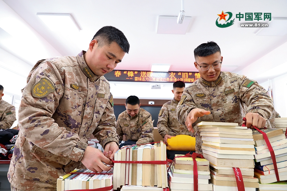 “雷锋班”所在连队官兵开展爱心助学活动。图为官兵捐赠图书。李东雪摄