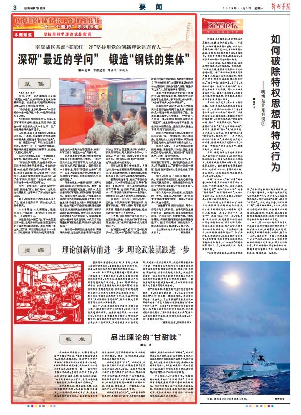 理论武装重在“结合”。一名基层教导员在分享工作体会时说,官兵看到身边的实践转化,就能品出理论的“甘甜味”。政治干部结合官兵实际,结合工作实际,多形式多渠道展现党的创新理论的真理力量、精神力量、实践力量,帮助官兵搞清楚、弄明白理论的源泉是什么、实践基础是什么、战略考量是什么,就能引导官兵更加自觉地以学铸魂、以学增智、以学正风、以学促干。