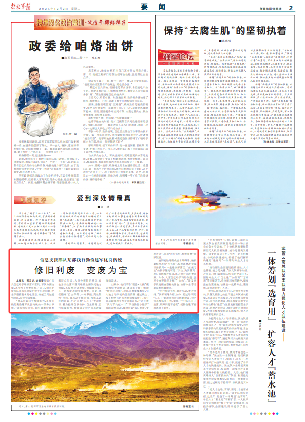 实践中,他们采取“理论+实操”模式组织专项培训,遴选军士骨干组成“教学示范组”,现场开展实操教学;引入地方培训机构优质资源,通过线上、线下相结合的方式培训维修骨干,部分官兵取得相关专业资格证书;广泛开展“我为节约献一计”“争当勤俭小能手”等群众性活动,鼓励官兵“修旧利废、变废为宝”,营造“厉行节约、杜绝浪费”浓厚氛围。