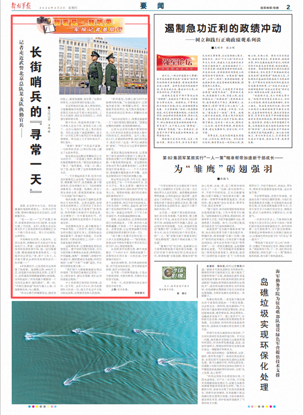 看着他们年轻而坚毅的脸庞,记者不由得想到,来自不同中队的哨兵,守好各自的一方哨位,连起来,就守护着十里长街的四季平安。这就像边境线上的一座座边关哨所,万千军人的忠诚坚守,共同筑就起钢铁长城。