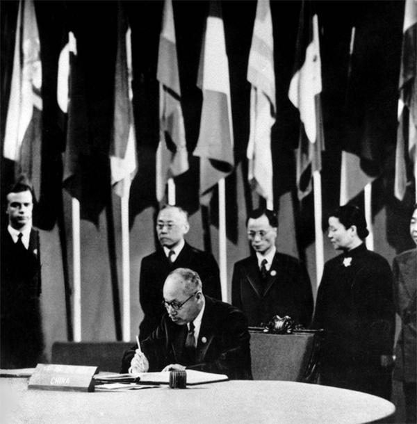 由于中国军民在世界反法西斯战争中发挥了极其重要的作用,与苏、美、英同为当时世界上坚持与轴心国作战的主力,中国获得了“四强”之一的称号。1942年1月1日,26个反法西斯国家在华盛顿签署《联合国家宣言》,中国进入与美、英、苏共同领衔签字的四大国之列。1945年4月,中国同美、英、苏共同发起旧金山会议,共商建立联合国。随着《联合国宪章》正式出台,中国成为联合国安理会5个常任理事国之一。