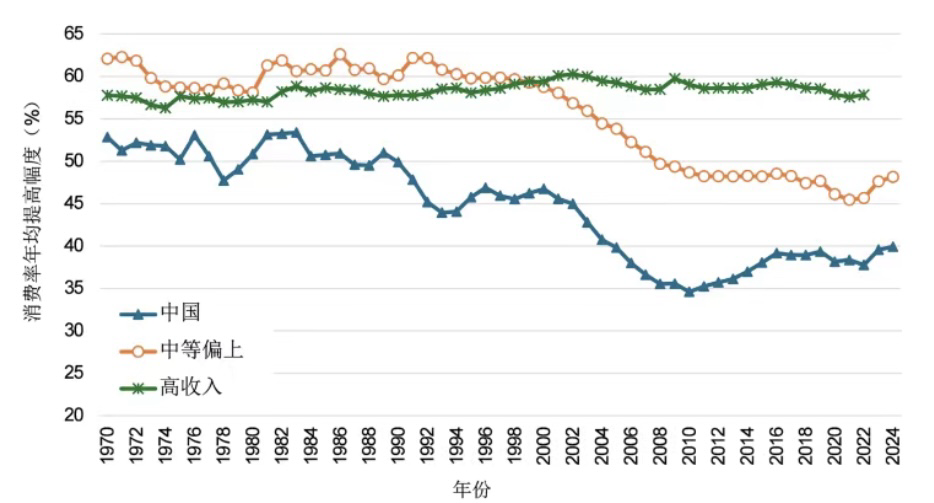 制约经济增长的主要因素转变,也对投资于人提出现实紧迫的要求。实现2035年成为中等发达国家所要求的增长目标,在需求侧面临的挑战比在供给侧更大,特别是居民消费能否得到有效提升,对于经济增长潜力的充分兑现具有决定性作用。根据世界银行数据库,2024年我国居民消费支出占GDP比重(消费率)为39.9%,中等偏上收入国家平均为48.2%,高收入国家(2022年)平均为57.8%。由此可以得出两个结论:一方面,我国居民消费率面临双重超越目标,一是与中等偏上收入国家平均水平趋同,差距约为8个百分点;二是向高收入国家平均水平赶超,即进一步缩小约10个百分点差距。另一方面,消费率趋同和赶超都是可以预期的目标。例如,从2010年到最近年份,我国消费率年均提高1.0%,而中等偏上收入国家和高收入国家分别降低了0.1%和0.2%(图2)。进一步加大对人力资本和民生的投资,有望进一步加快赶超速度,实现党的二十届四中全会设定的“居民消费率明显提高”目标。