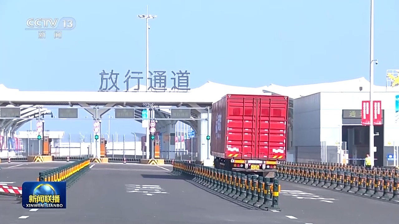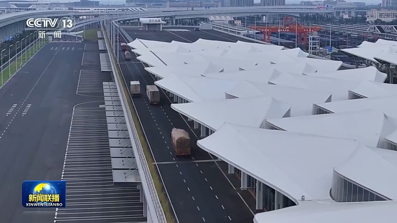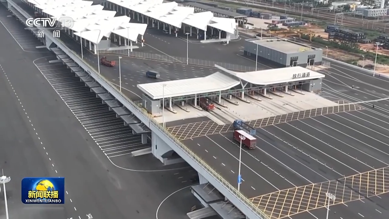 总台央视记者 王雷:我现在在海口新海港和南港“二线口岸”货运集中查验场,在我身后,第一批装载着享受加工增值免关税政策货物的车辆,正在顺序通过海关监管通道,准备进入内地。