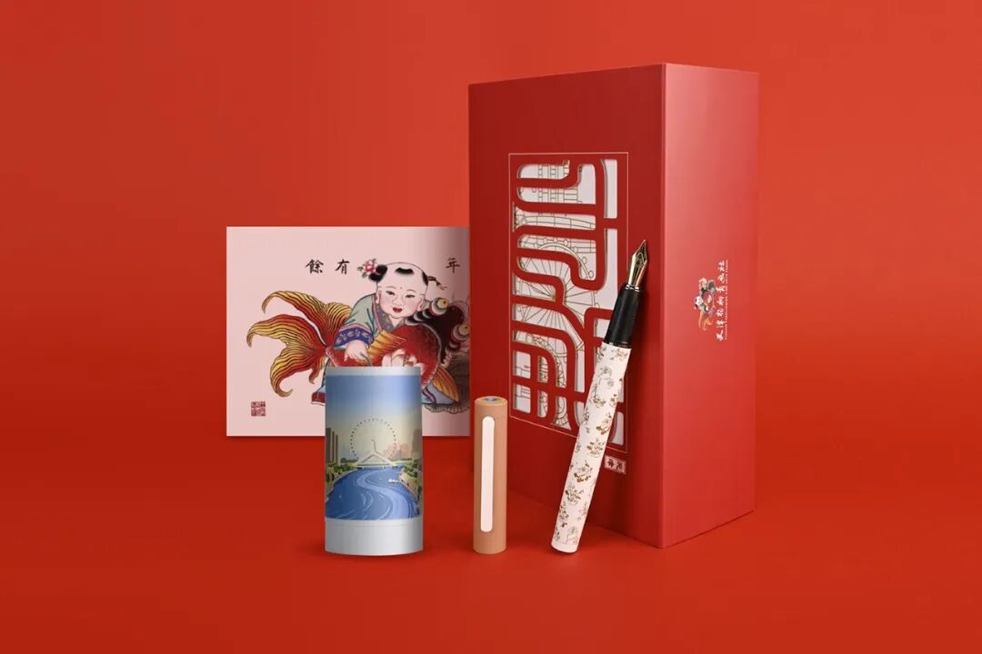 经过无数次的设计碰撞、方案推敲和打样调整,鸵鸟墨水和杨柳青画社将蜿蜒的海河、璀璨的天津之眼、吉祥的杨柳青年画元素等,化作精美的纹饰,融入礼盒与钢笔的设计中,使百年老字号的匠心精神和新时代天津的开放活力巧妙融合,最终形成了“津彩上合”主题钢笔文创礼盒。礼盒中的钢笔精工细作、色彩典雅,书写流畅舒适,得到中外嘉宾的一致好评。