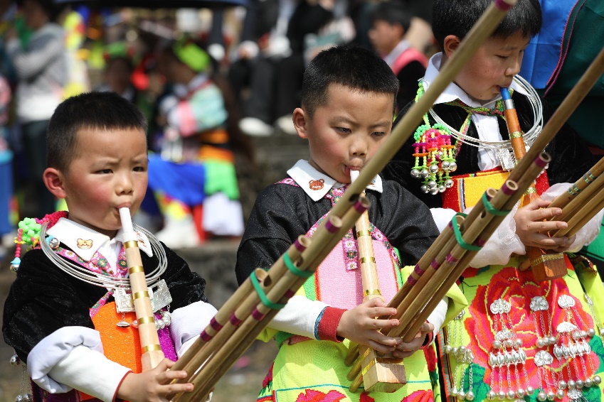 节日中苗族娃娃吹起芦笙。(王华乔 摄)