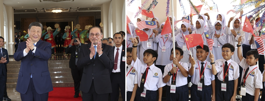 习近平乘车抵达总理官邸时,安瓦尔热情迎接。马来西亚青少年挥舞两国国旗,奏响欢快的鼓乐,跳起热情的民族舞蹈,热烈欢迎远道而来的贵宾。