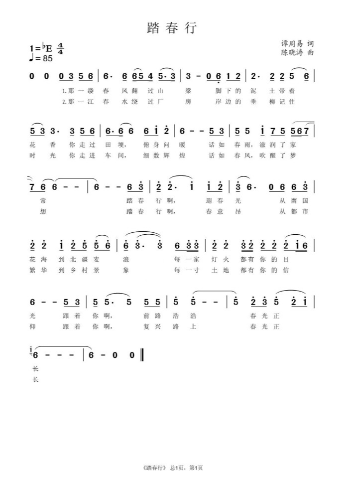 歌曲的旋律也有着恢宏大气、细腻走心的特点。曲作者陈晓涛,系西安音乐学院教授,西安音乐学院新红歌创编实践工作室带头人,歌曲曾获中宣部“五个一工程”奖、当代歌曲创作精品工程奖等多项国家级奖项,作品被阎维文、宋祖英、廖昌永、戴玉强、韩雪、陈勇、和慧、孙浩等多名歌唱家及歌手演唱,音乐剧作品曾荣登央视春节联欢晚会及元旦晚会。为避免作品陷入“宣教感、舞台腔”,破坏歌曲原本细腻走心的气质,她匠心独运,独出机杼,其音乐设计是彻底放弃主旋律式合唱,走艺术歌曲 + 电影配乐感 的抒情路线,在调式与速度方面,♭E大调、4/4拍、♩=85的行板速度,奠定了舒展、昂扬、明快的基调,既适合独唱演绎,也适配合唱的和声展开。在结构设计方面,为标准单二部曲式(A主歌+B副歌),结构清晰,层次分明。主歌(A段),旋律以级进为主,辅以小三度、纯四度小跳进,线条平缓舒展,贴合叙事性歌词,营造出春风拂面的画面感;节奏以均分八分音符+附点节奏为主,既保证流动性,又强化口语化语气,让歌词自然融入旋律。在副歌部分(B段),音区整体抬高,加入八度大跳(如 i 6 )、长音延留,旋律线条大幅上扬,形成情绪高潮;节奏加入切分、延音,增强推动力,完美契合“踏春行、迎春光”的昂扬情感,具备极强的记忆点和传唱性。在旋律细节方面,多处运用装饰音、连音线,增强旋律的抒情性与流畅度;结尾以长音 i 6 - - - 收束,余韵悠长,强化主题的升华感。所以,这首歌曲一经创作推出,就广获好评。歌曲打动人心,在于它并非高亢的宣誓,而是一路行走的发现与感悟,也让读者在“踏春行”的旅途中,亲眼看见了“春光正长”,看见了万物生长的希望。