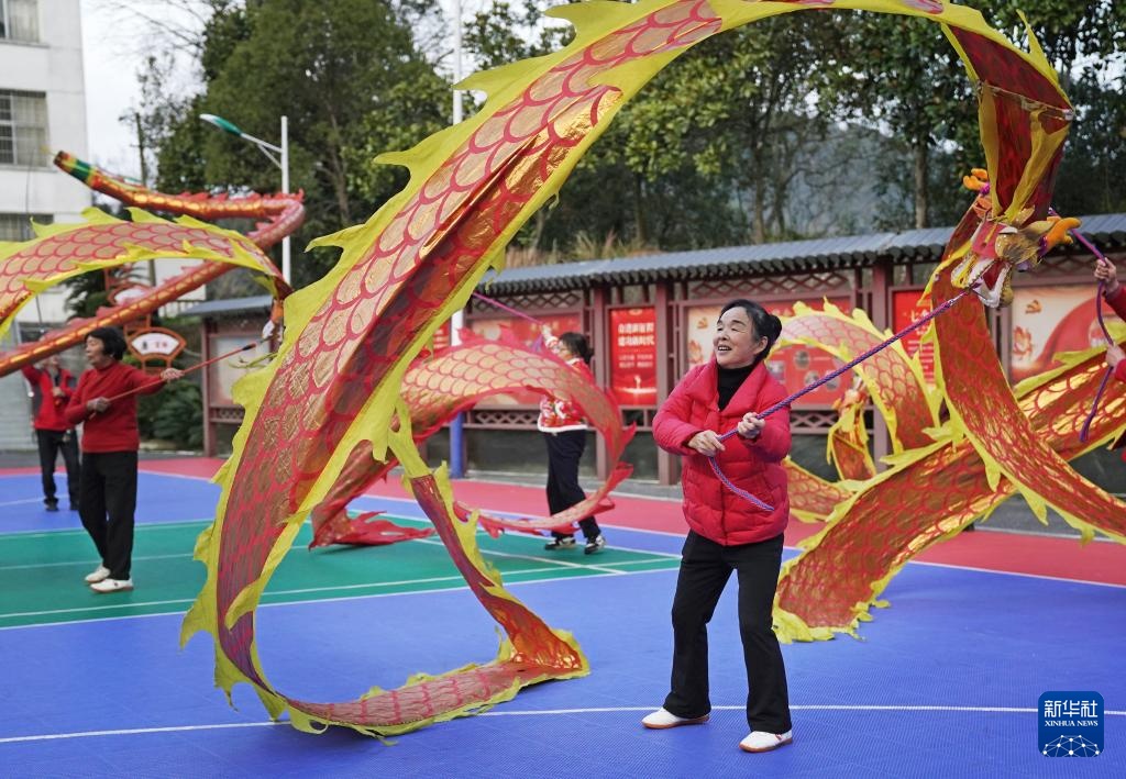 在江西省宜丰县官山林场,吴忠华(右一)与伙伴们一起耍彩带龙健身(3月5日摄)。新华社记者万象摄
