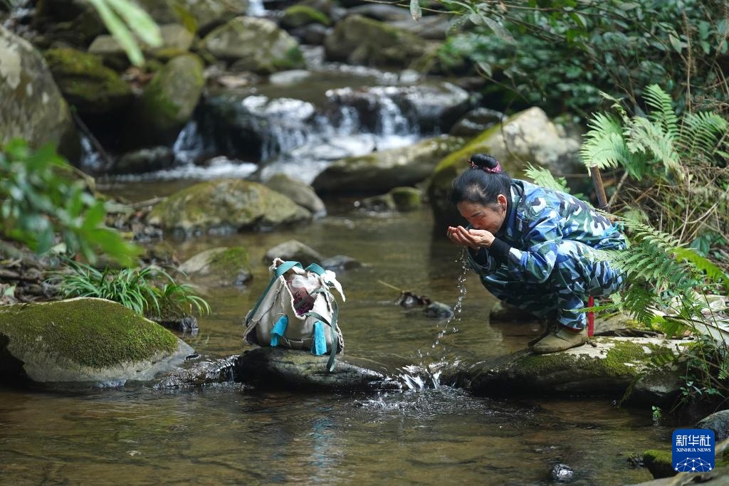 吴忠华在江西省宜丰县官山林场森林里的小溪边洗脸休息(3月5日摄)。新华社记者万象摄