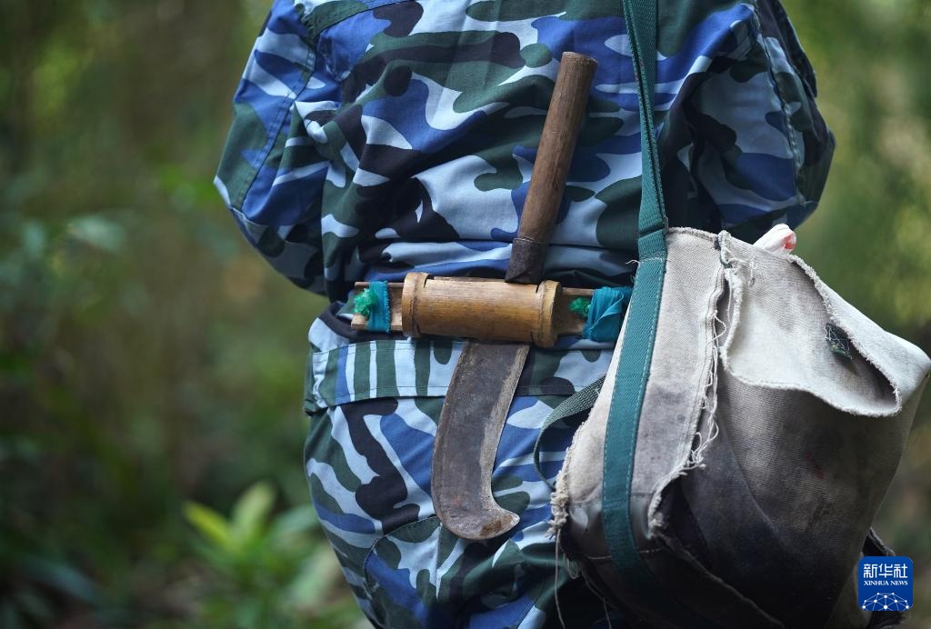 吴忠华腰间别着父亲传给她的的柴刀(3月5日摄)。她平日里用这把柴刀开路、防身。新华社记者万象摄