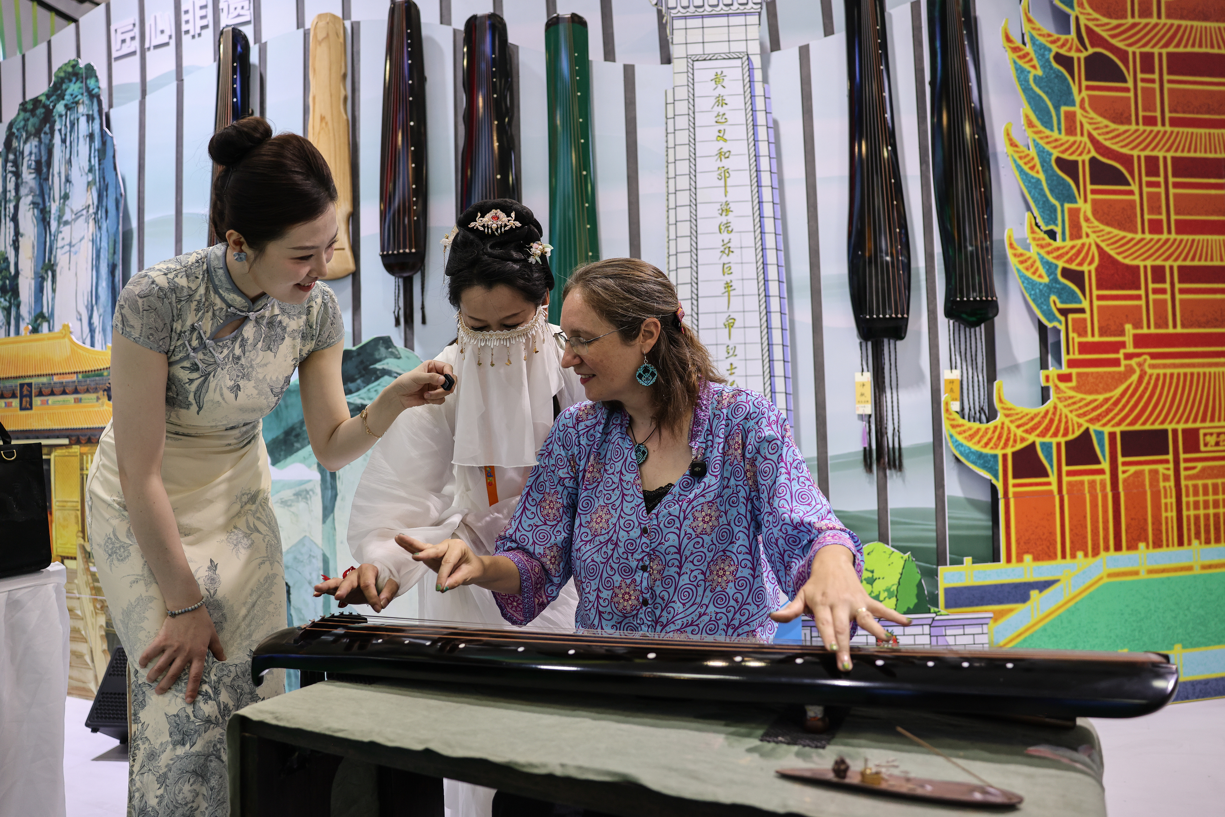2026年4月15日,海南海口,第六届消博会国货精品展区外国参观者体验中国古琴。