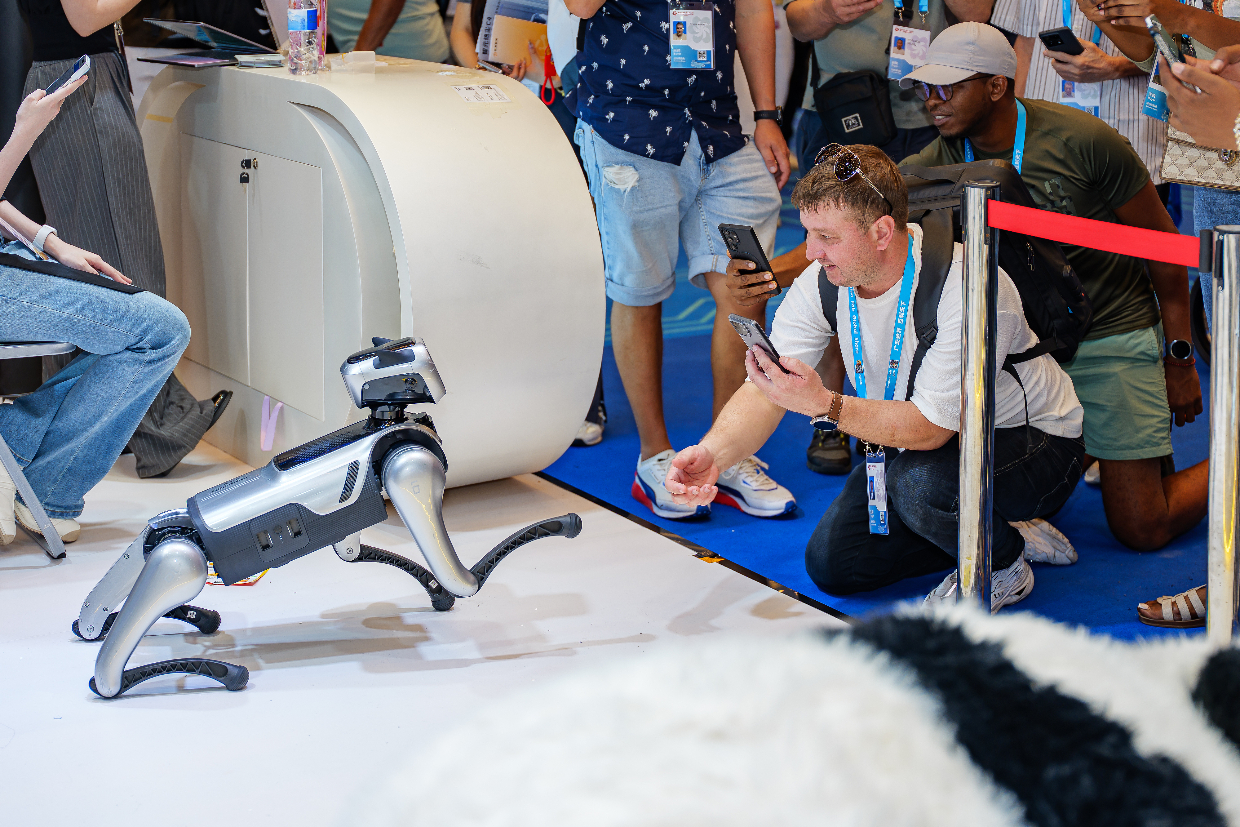 2026年4月19日,广州,第139届广交会服务机器人专区的一款四足机器狗吸引采购商驻足互动。