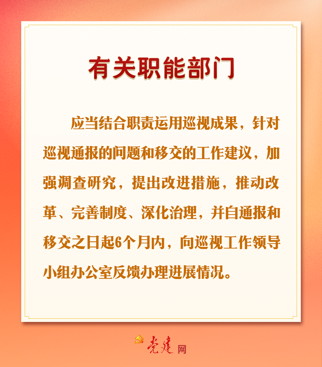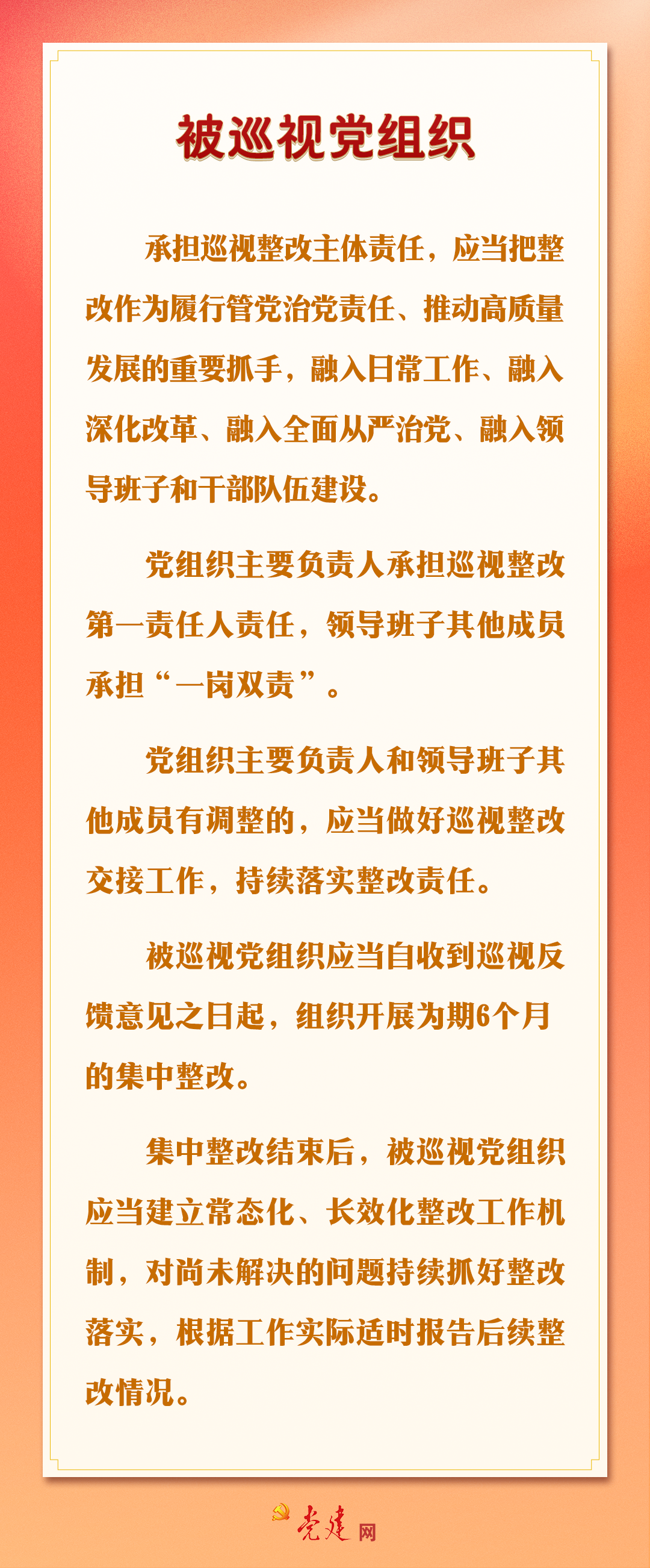 巡视是推进党的自我革命、全面从严治党的战略性制度安排。近日,中共中央印发了修订后的《中国共产党巡视工作条例》,其中专门单列一章,对巡视整改和成果运用作出明确规定,释放出强烈信号,要在强化整改落实和成果运用上见真章、求实效。快来一图学习相关工作要求!