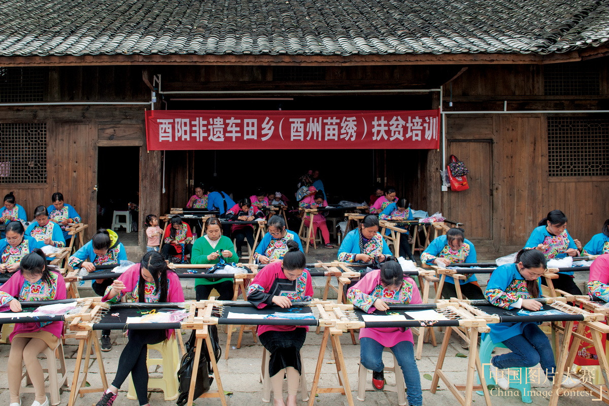苗绣以线为笔,以布为纸,把苗族的起源和信仰,都一针一线缝在了服饰上,这就是为什么苗绣被称为“穿在身上的史书”,代表了中国少数民族刺绣的最高水平。2006年5月20日,苗绣经国务院批准列入第一批国家级非物质文化遗产名录。2019年,重庆市酉阳土家族苗族自治县妇联在车田乡猫头坝村开展“巾帼精准扶贫”手工编织培训班,让手工技艺在焕发新生命的同时,也让酉阳苗族女子巧手编织出幸福梦。