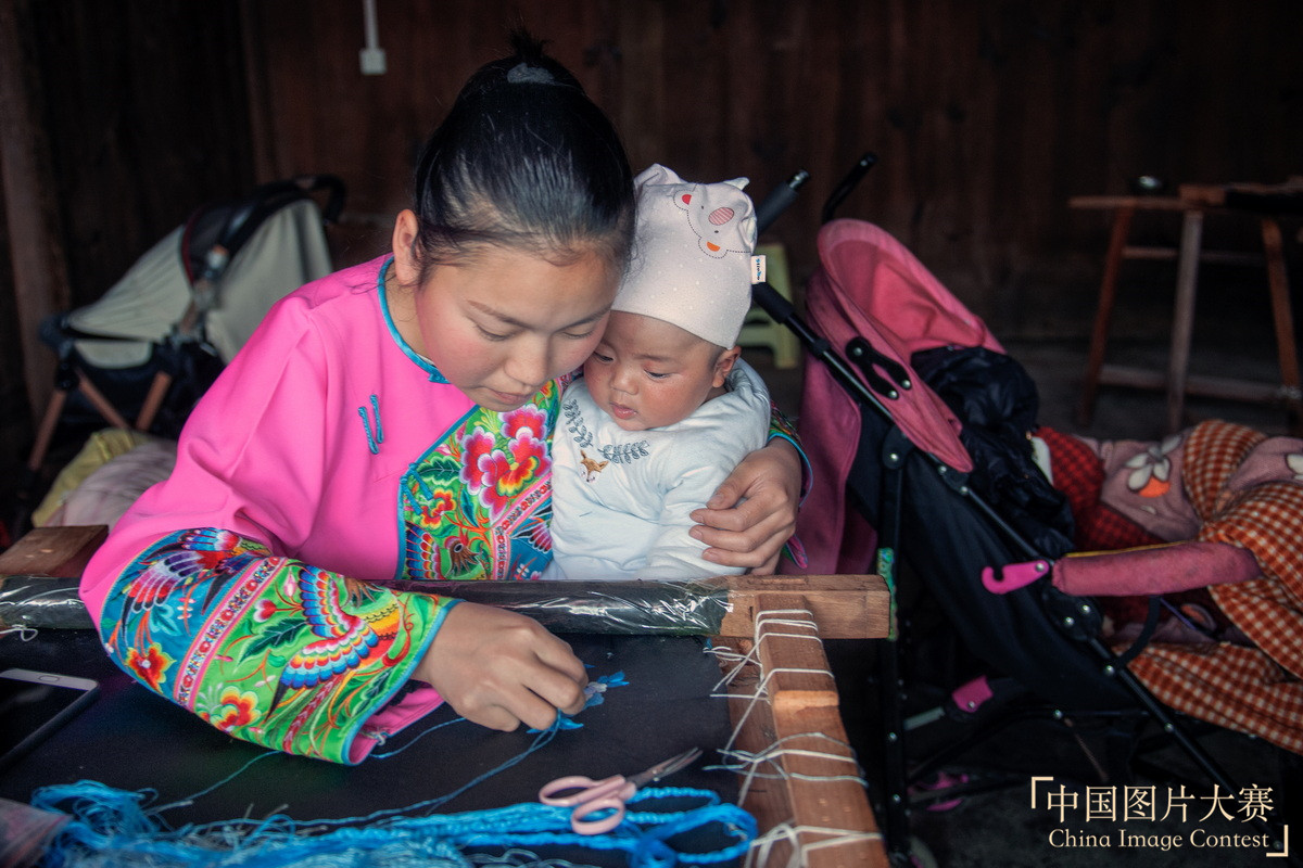 年轻的妈妈带着小孩认真地绣花。 张朝阳 摄